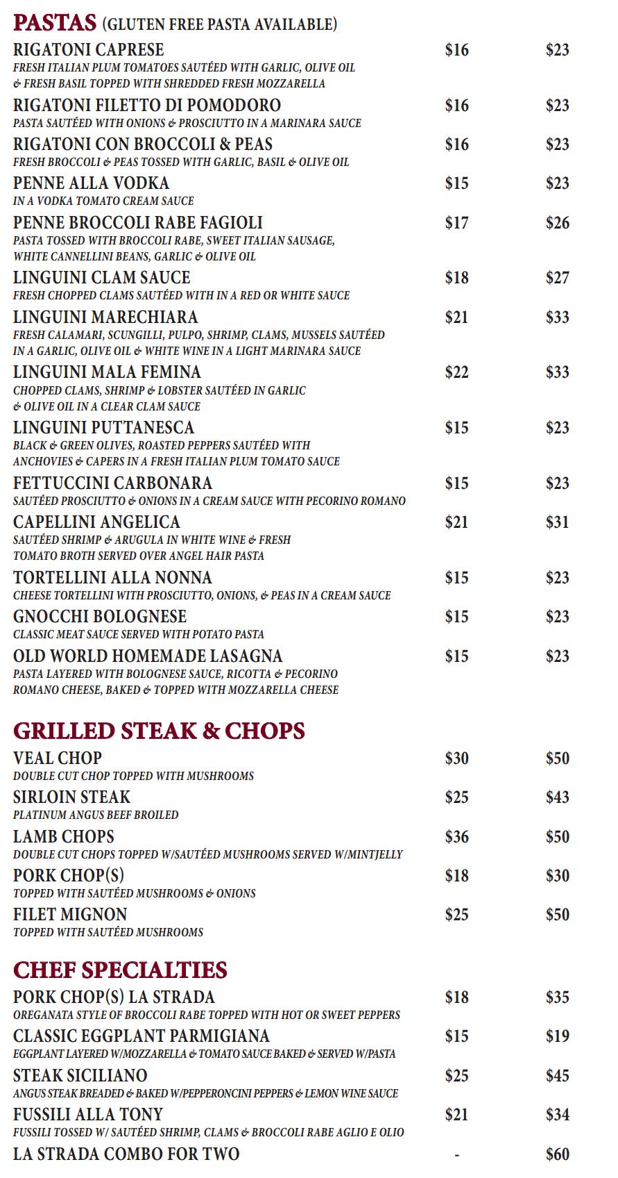 Please Note: La Strada, unfortunately, has no control over menus represented as ours on other dining, catering or delivery websites. They are posted without our consent, knowledge or permission and we assume no responsibility for menu selections or pricing as listed on them.